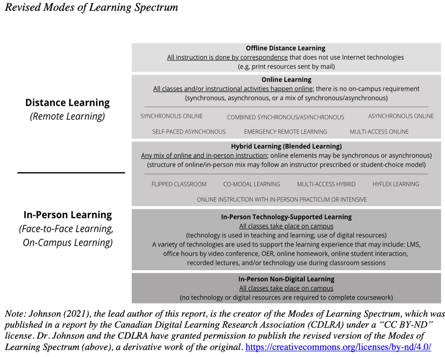 Outside of the graphic is a note: Johnson (2021), the lead author of this report, is the creator of the Modes of Learning Spectrum, which was published in a report by the Canadian Digital Learning Research Associate (CDLRA) under a “CC BY-ND” license. Dr. Johnson and the CDLRA have granted permission to publish the revised version of Modes of Learning Spectrum (above), a derivative work of the original. https://creativecommons.org/licenses/by-nd/4.0/